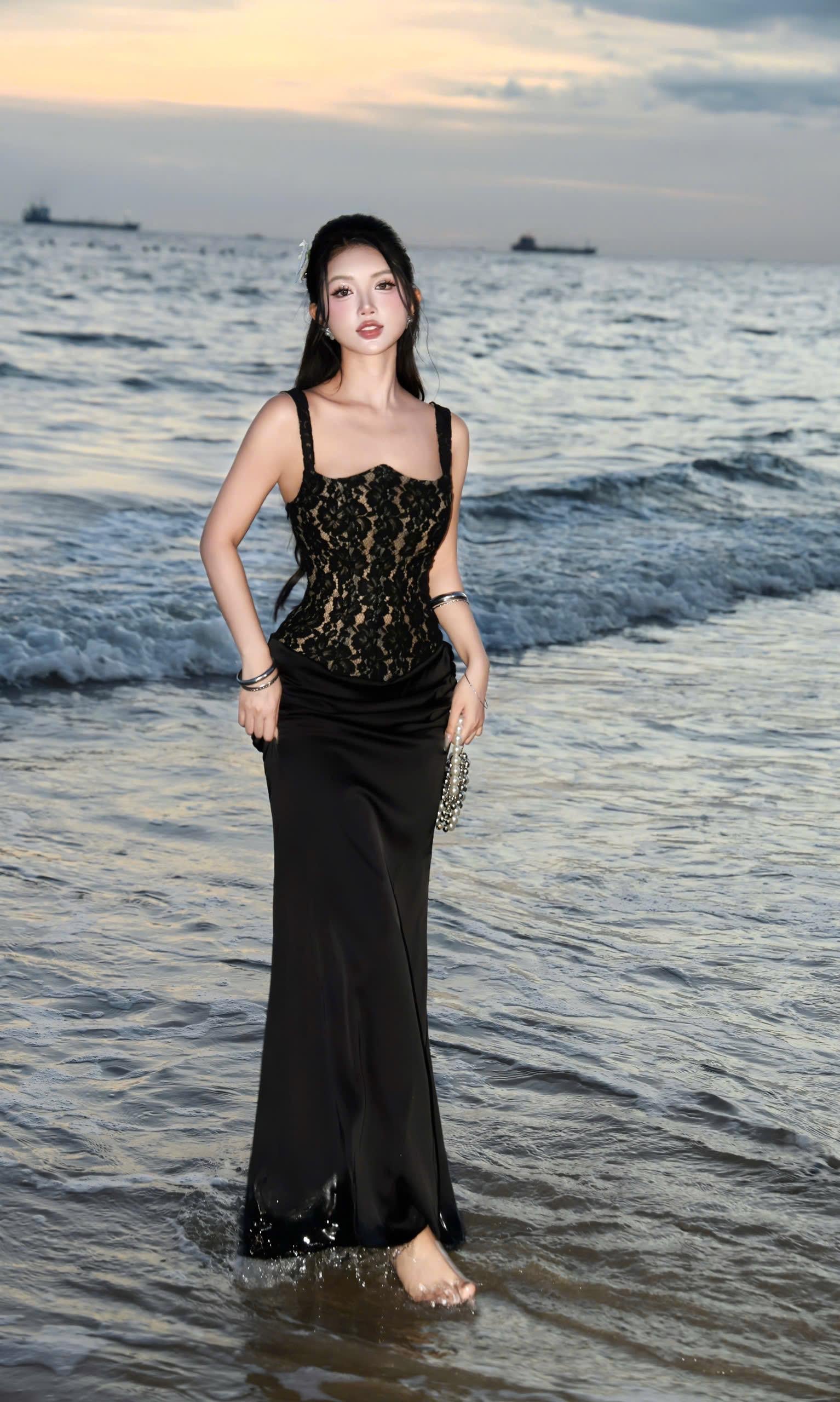 ✧ Fitted lace corset bodice draped with a sleek black satin skirt