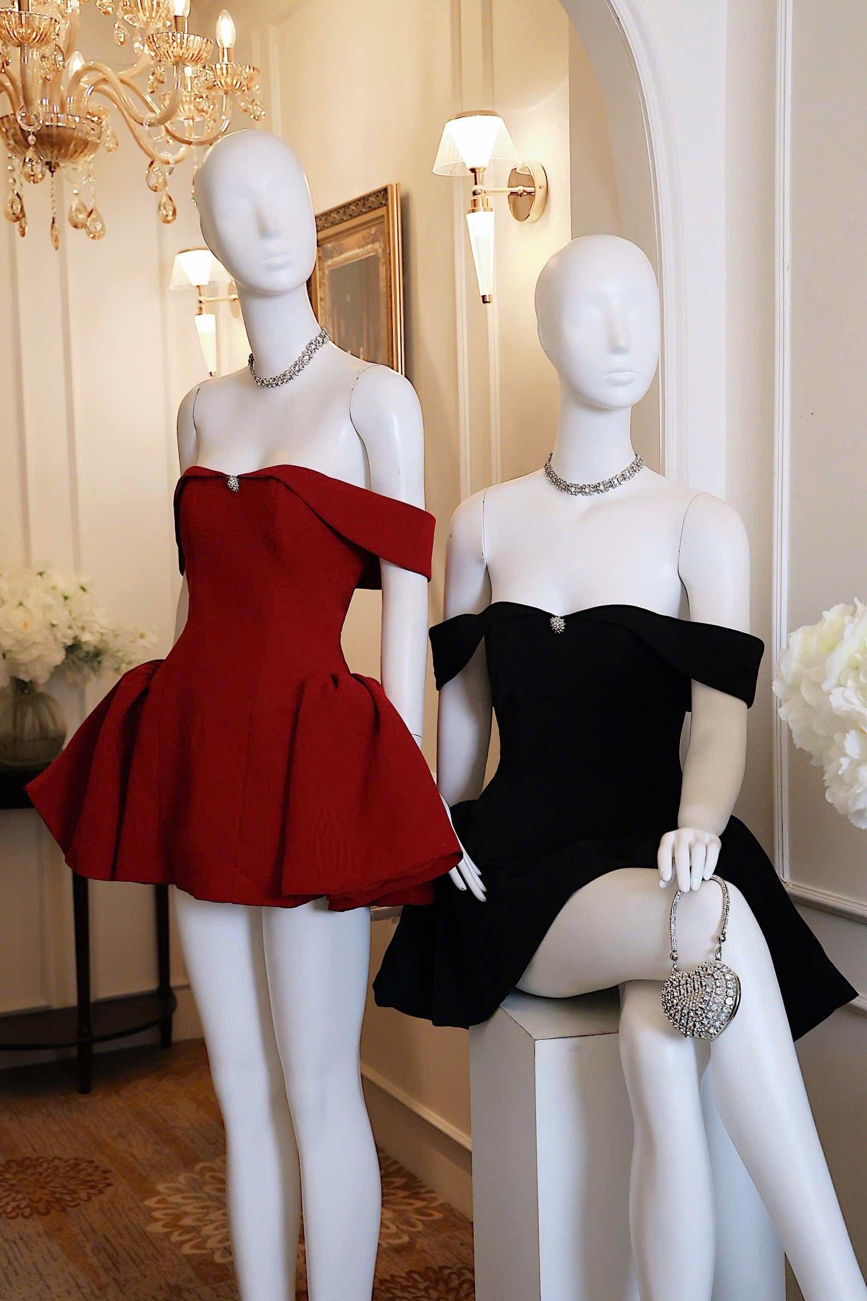 ✧  A timeless off-shoulder black red dress with structured draping and a crystal accent — the perfect blend of modern sophistication and Parisian couture charm.