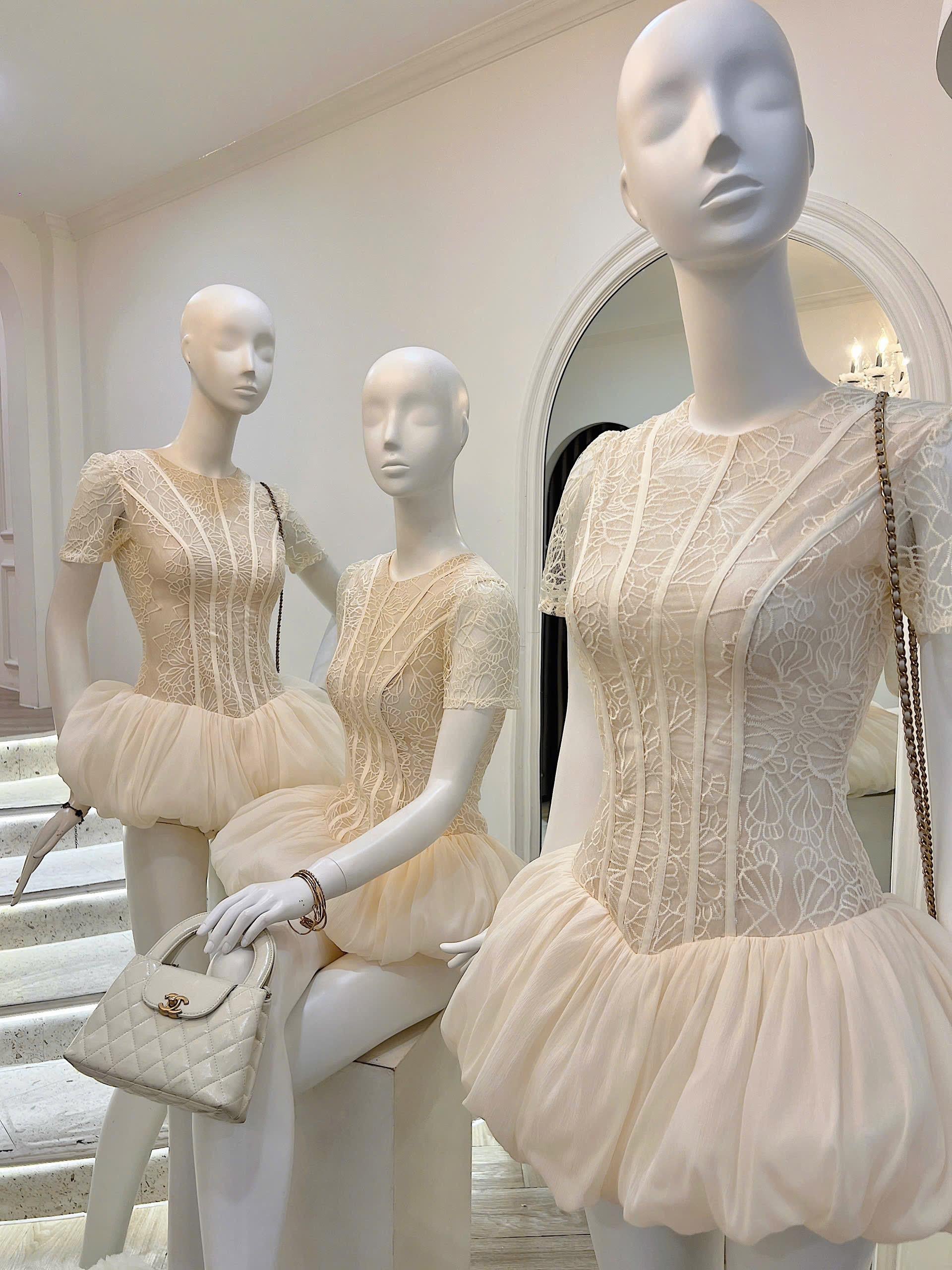 ✧ An ethereal ivory mini dress featuring a sheer lace bodice and a softly puffed skirt, radiating delicate grace and modern romance.