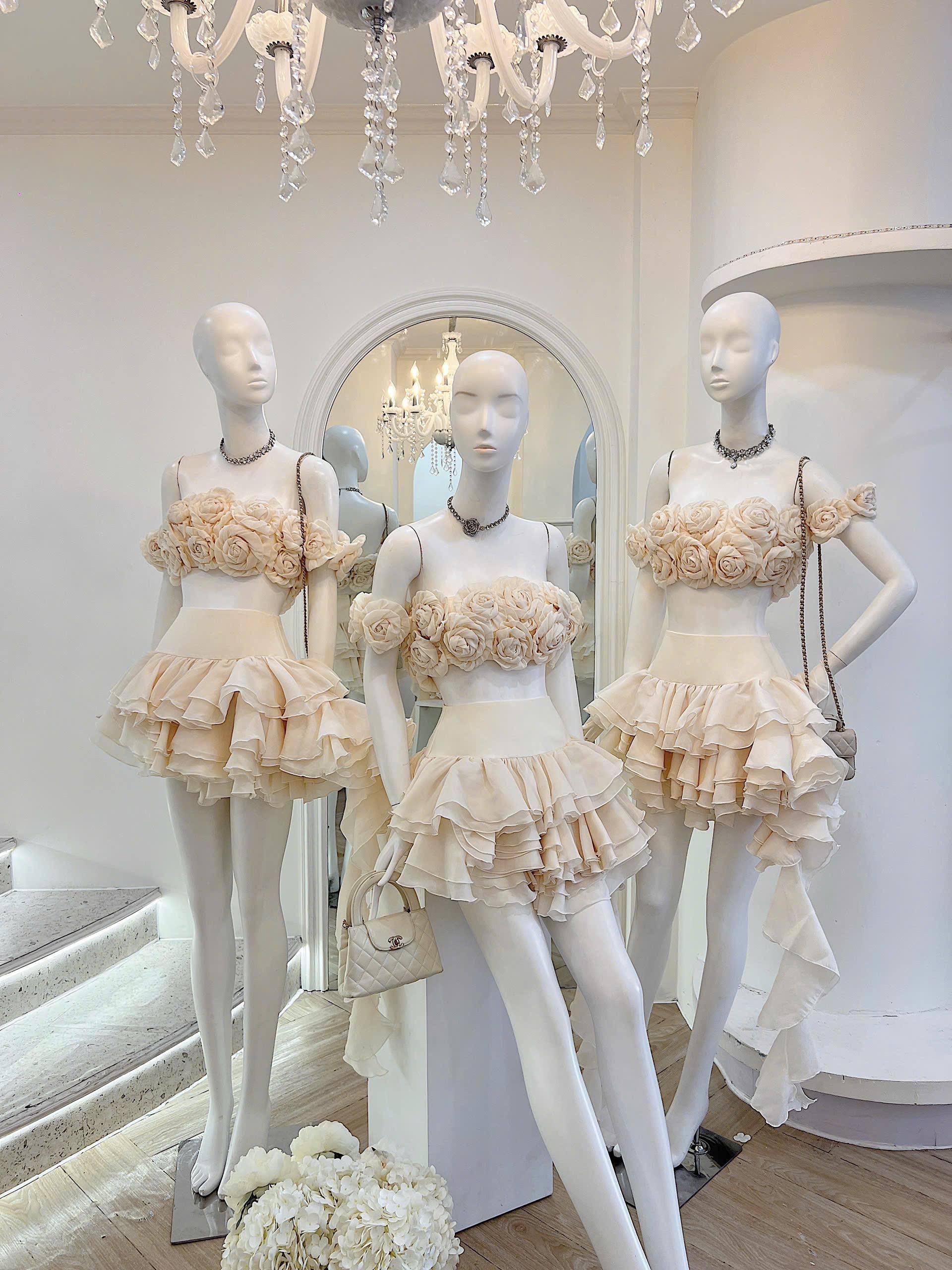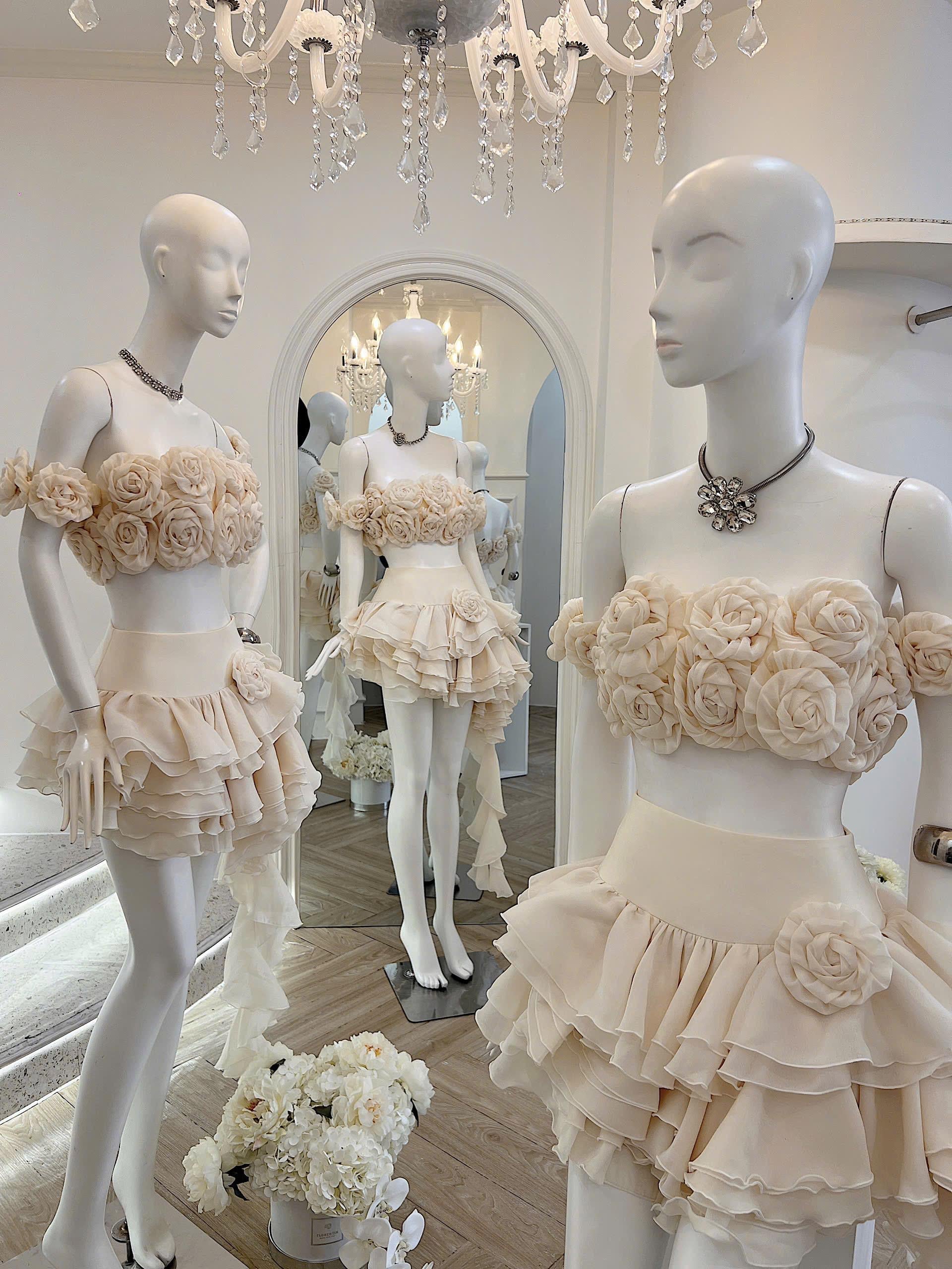 ✧ A dreamy couture ensemble adorned with delicate floral appliqués and cascading ruffles — a perfect harmony of romance and whimsy.