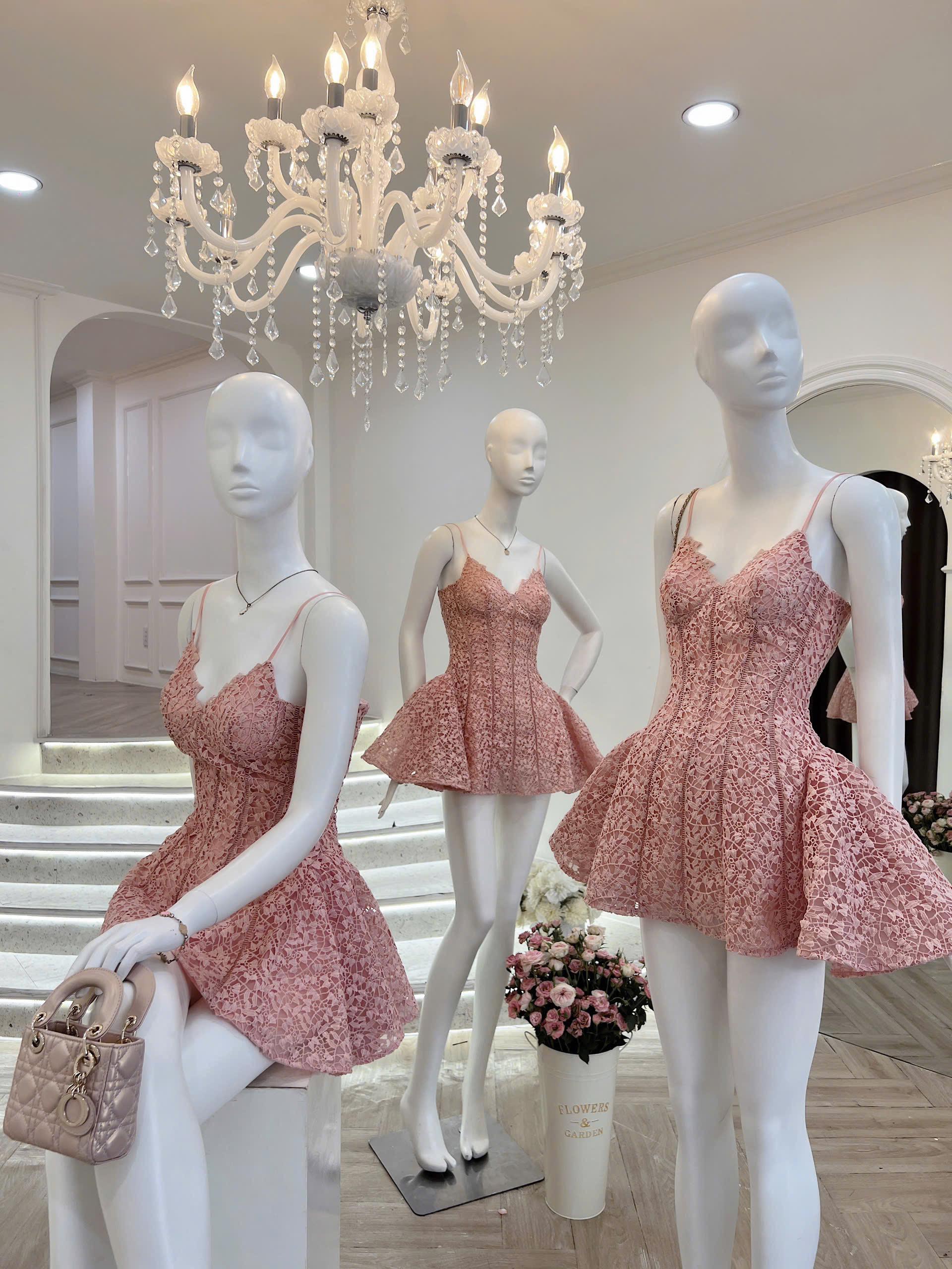 An enchanting pink lace mini dress with a structured silhouette and delicate straps — exuding timeless allure and modern couture elegance.