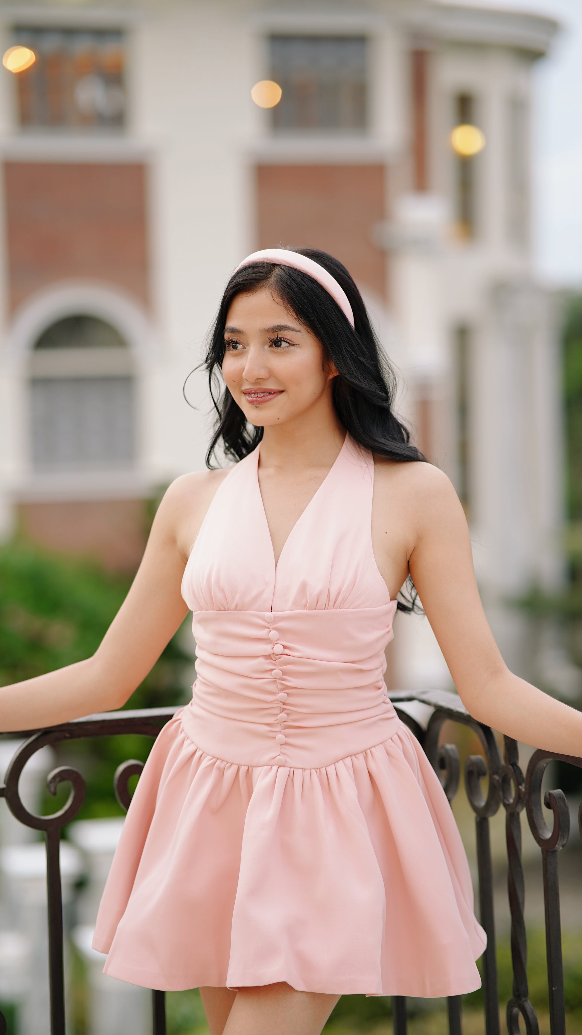 ✧ Halter-style mini dress with flattering ruched waist with a-line skirt