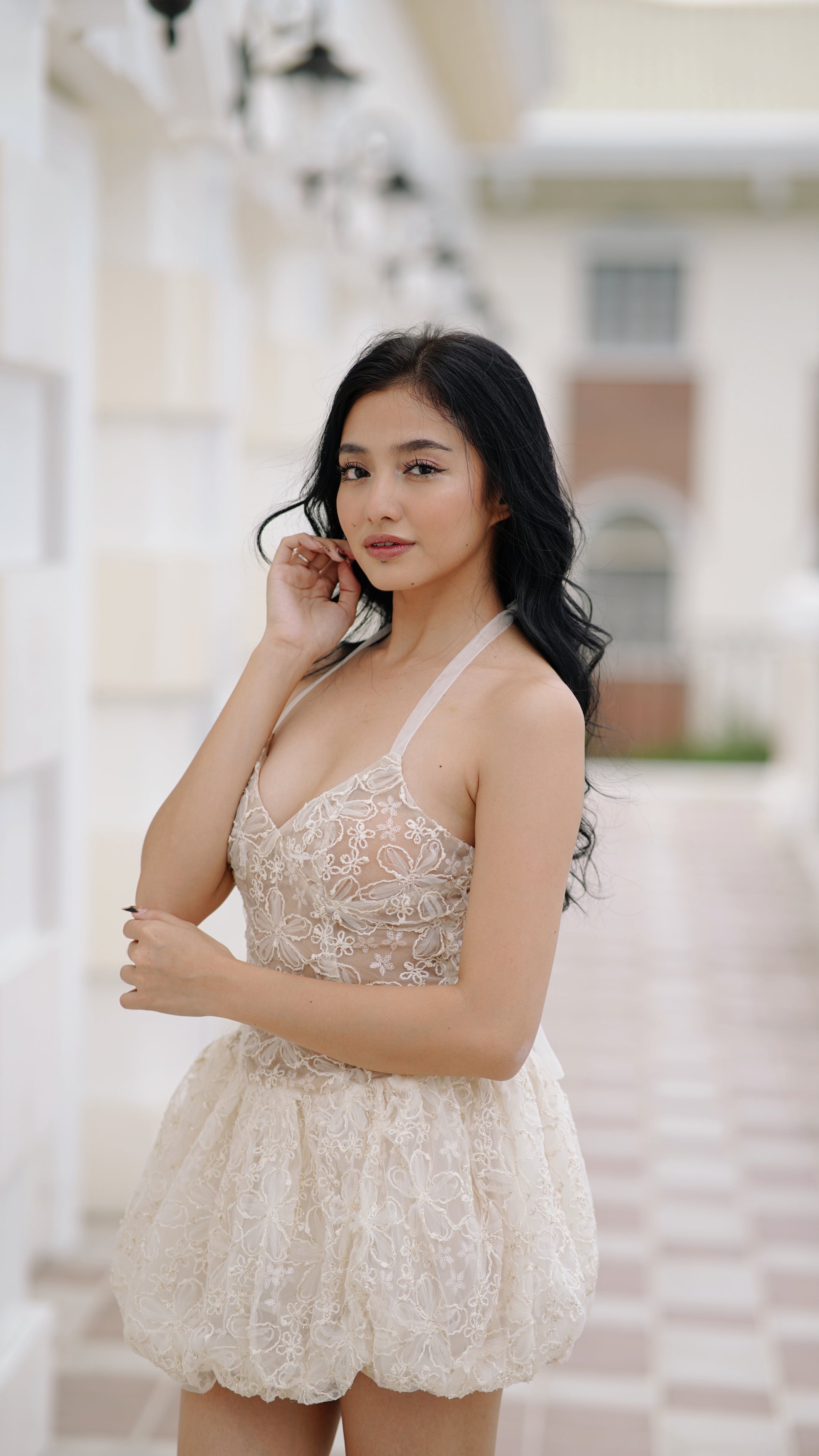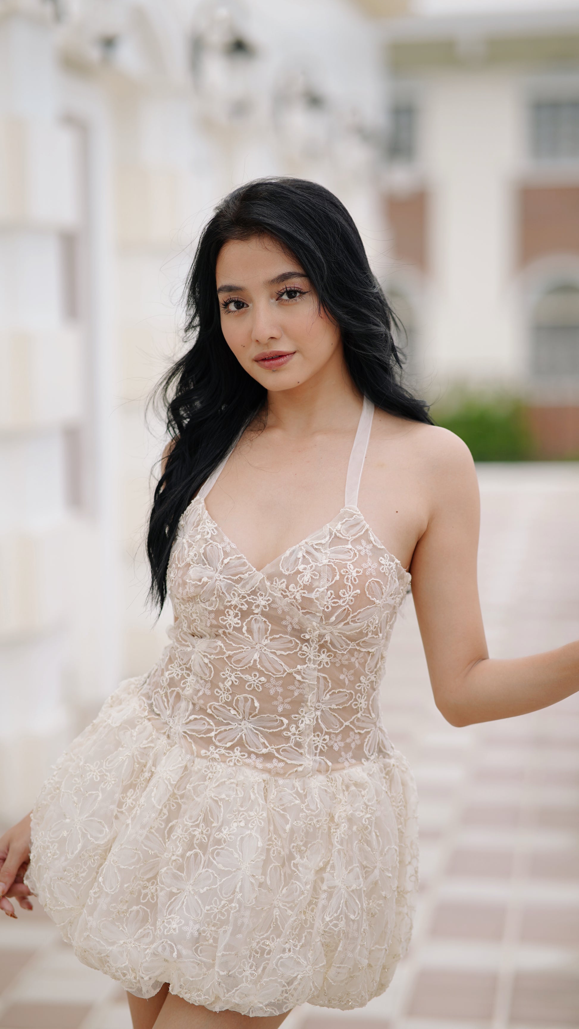✧ Sheer mini dress with delicate floral embroidery and bubble skirt
