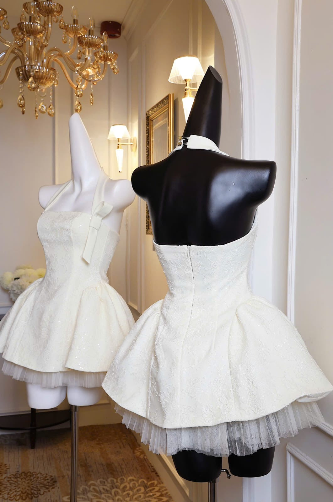 ✧ A charming mini dress with a structured bodice, flared bubble skirt, and delicate lace detailing. Finished with a statement bow strap, it blends romantic femininity with couture sophistication.